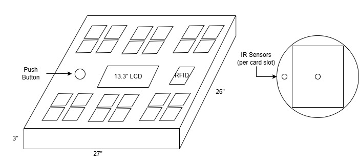 The board itself is a 27”x26”x3” wooden box. The board is split into three sections along its width. There are two sections where players will place cards each taking up 9” of the width. Sandwiched between the card sections is an 8” section that will contain the screen. The screen itself is a 13.3” LCD screen that is centered on the board (dimensions ≈ 12.8” x 8”). To the left of the screen in the center section there will be a large push button. To the right of the screen in the center section, the RFID sensor will be housed. Each of the card sections will have slots for 12 cards in a 6x2 matrix. Card positions are read into the system via IR sensors housed below the board surface, each card slot contains 2 IR sensors. The first IR sensor is used to determine whether a card is there or not, the second sensor is used to determine if a card is tapped or not (tapped is a colloquial term for turned 90 degrees in TCGs), therefore, the second IR sensor will be offset to the left of the first.