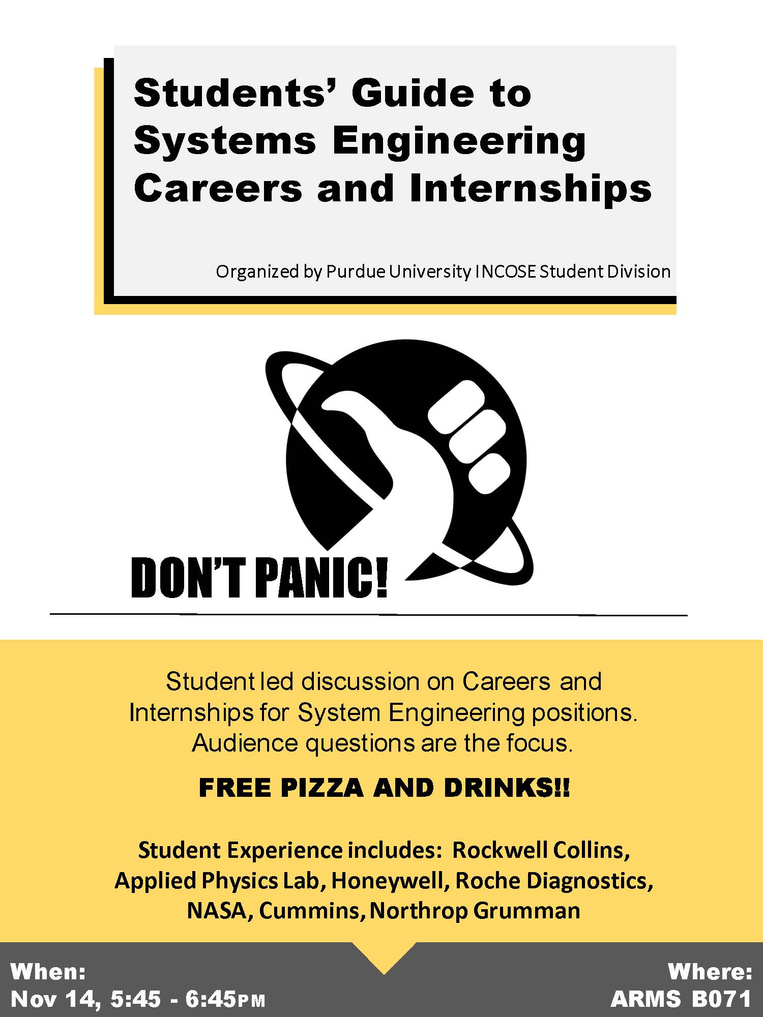 As we are coming to an end of the Fall 2016 semester, we hope everyone is finding internships or full-time job opportunities that align with their interests. Purdue University International Council on Systems Engineering (INCOSE) Student Division will be holding a student panel to discuss what students should expect in Systems Engineering careers and internships.