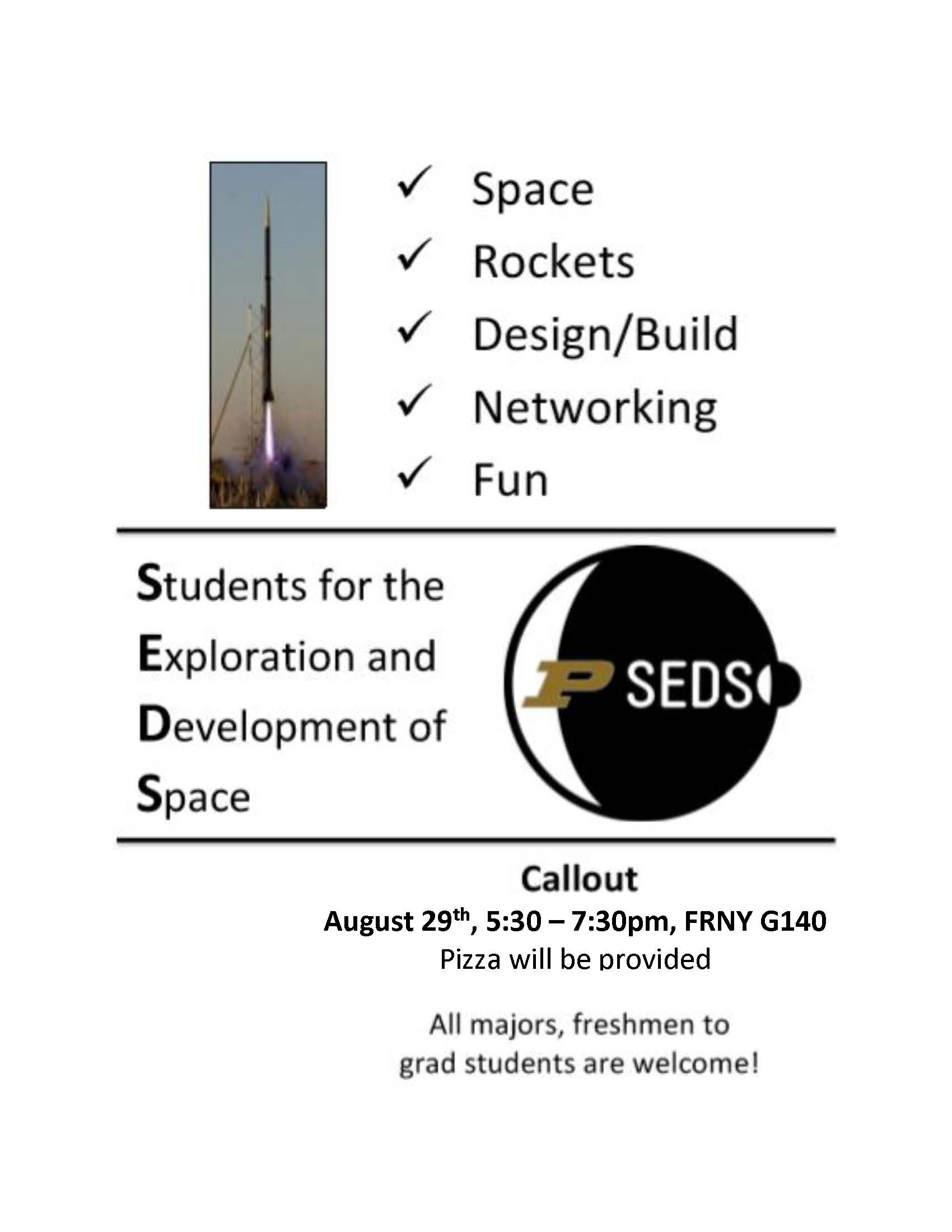 Purdue SEDS's Fall Callout will be in FRNY G140 on August 29 at 5:30 PM! Free pizza and refreshments will be provided, and all majors are welcome!