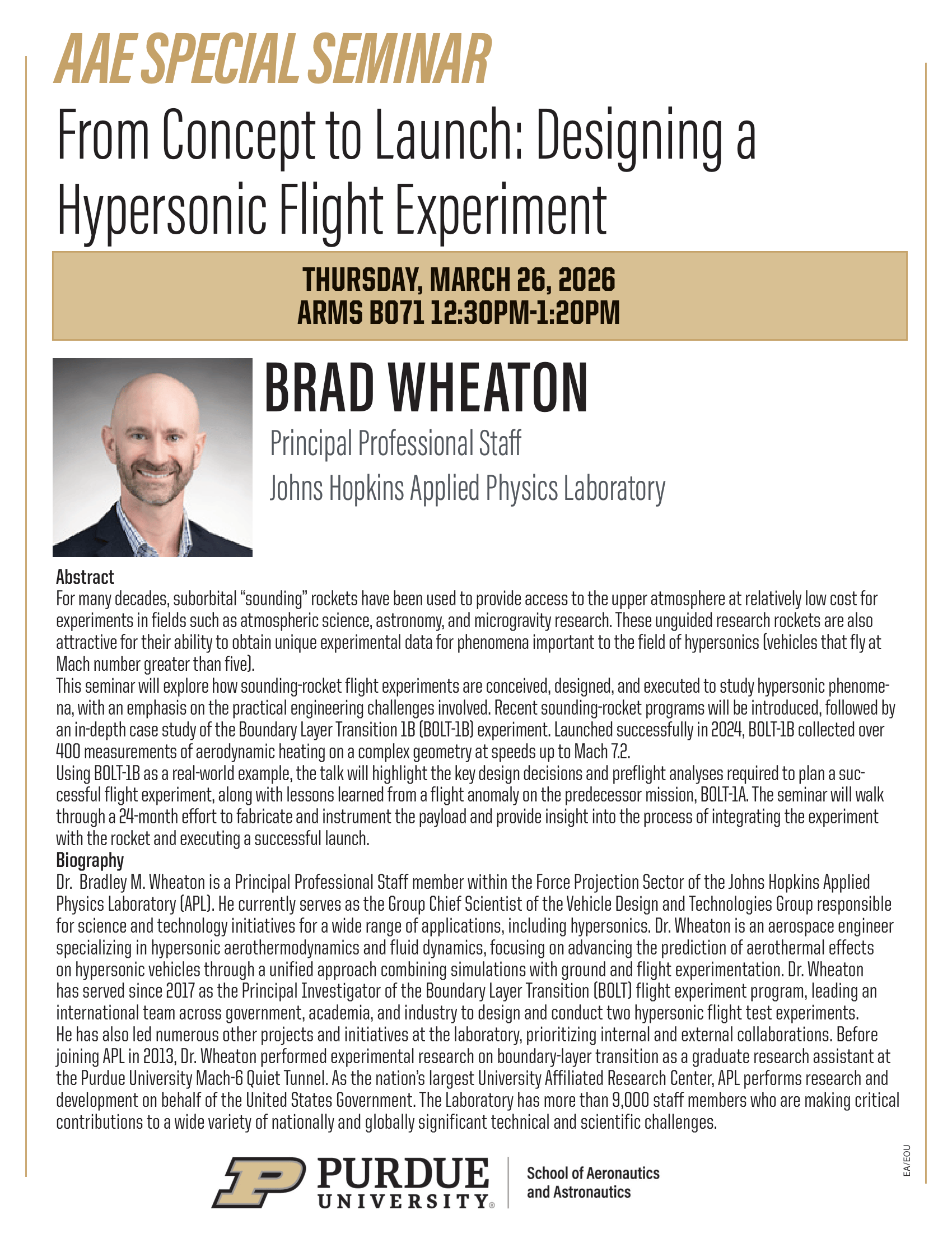 AAE Special Seminar: From Concept to Launch- Designing a Hypersonic Flight Experiment