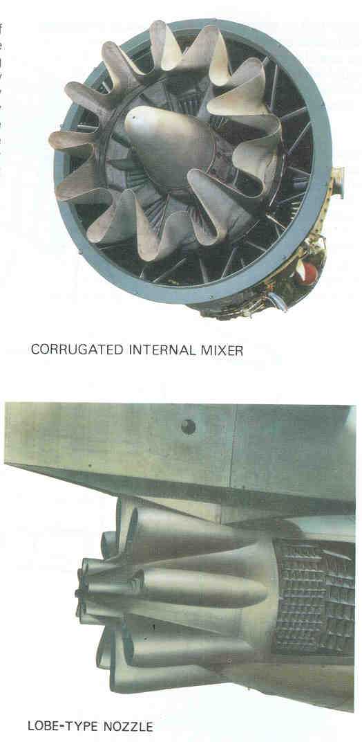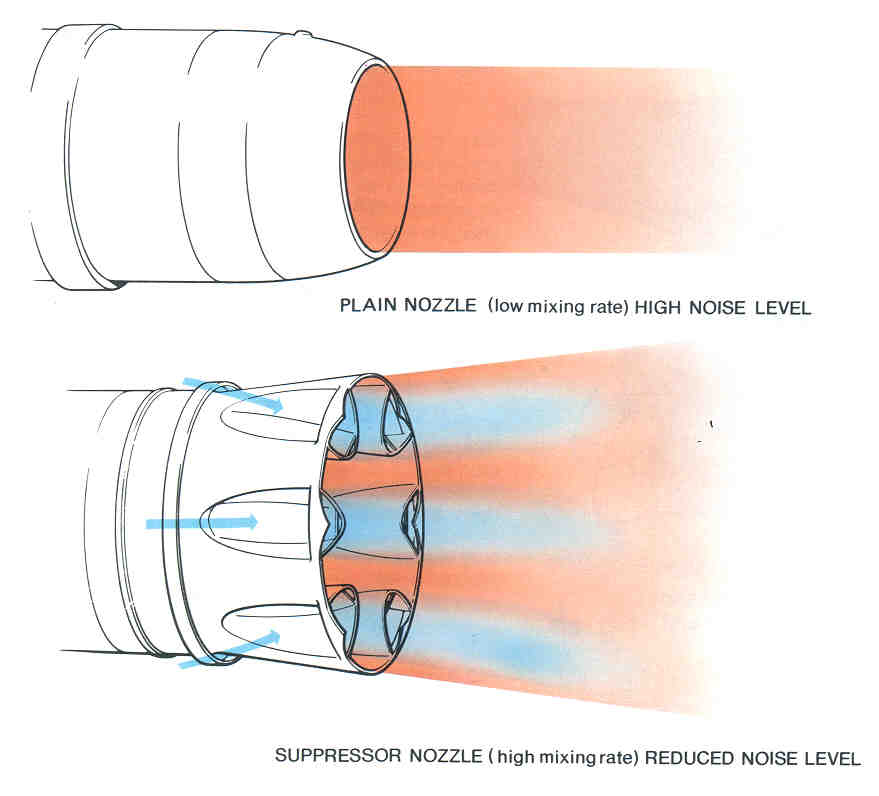 Again, the noise reduction principle is to minimize the exhaust jet velocity while still maintaining performance objectives. The most successful method used is to mix the hot and cold exhaust streams within the engine and expel the lower exhaust gases through a single nozzle. |
