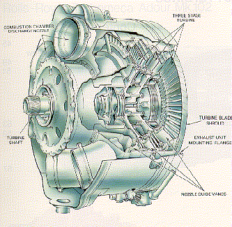 The turbine provides the torque necessary to drive the compressor and any other auxiliary equipment (hydraulics, cabin controls, electrical) required for engine and aircraft operation. Turbines can also be used to drive fans, rotors, or propellers in other airbreathing engine configurations. Because of the extreme environment, the turbine blades are made of some of the most advanced materials available. Even using these materials, the turbine inlet temperature is limited by the strength of the blade materials. Since the turbine inlet temperature drives engine performance, there is a great desire to operate at temperatures near the limits of the material. Advanced blade cooling schemes have been developed toward this goal. A turbine works like a compressor in reverse. Static nozzles convert pressure to velocity, and a moving section converts that velocity to rotational motion. Again, there are two types, both centrifugal and axial, but axial turbines are far more common.