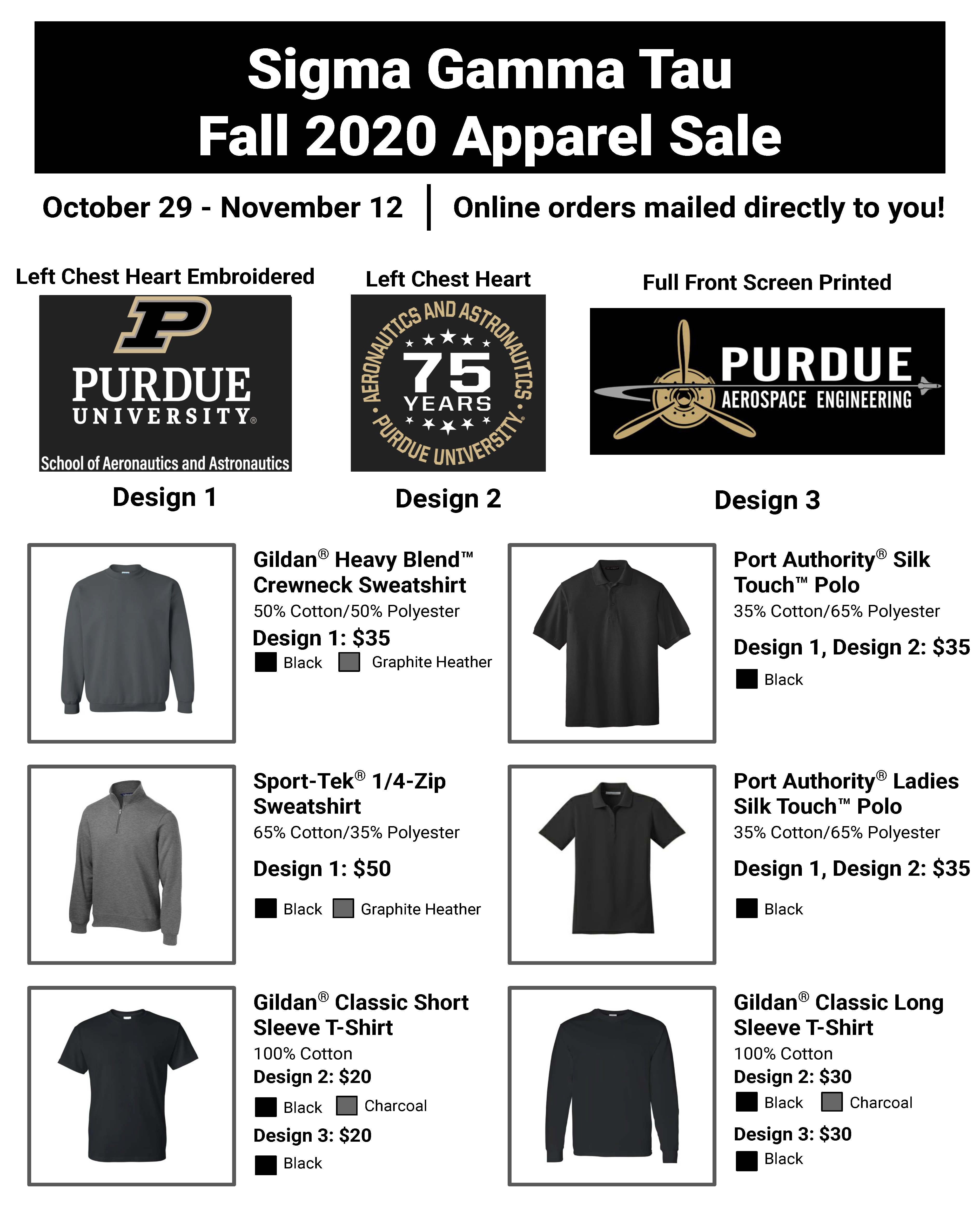Over the next two weeks, October 29th through November 12th, SGT will be holding our Fall Apparel Sale! This is your chance to get official Purdue Aeronautics & Astronautics apparel, as well as 75th anniversary polos and T-shirts! See the flyer below for all the available items.