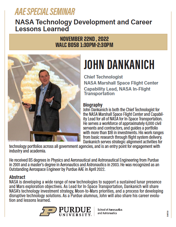 The AAE Special Seminar Series welcomes John Dankanich, Chief Technologist at NASA’s Marshall Space Flight Center, on Tuesday, November 22nd from 1:30-2:30 p.m. in WALC B058.
