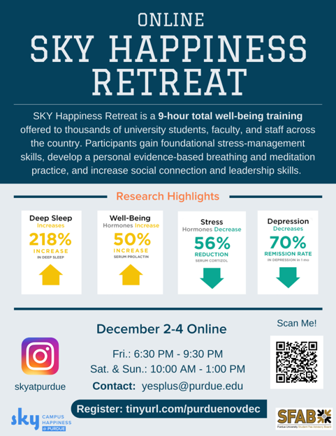 We're happy to share that the SKY Happiness Retreat is sponsored by SFAB, offered for free to undergraduates, and reduced rates for graduate students, staff, and faculty. There are limited spots available for this retreat. Availability is first come, first served, by registration only, and requires attendance to all sessions. Please contact yesplus@purdue.edu for any questions.