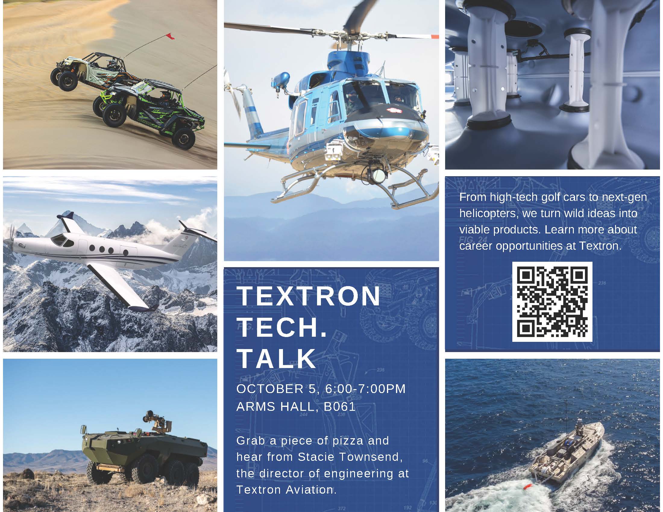 Textron is planning a recruiting visit and Tech Talk on October 5th from 6:00-7:00 p.m. in ARMS B061. Grab a piece of pizza and hear from Stacie Townsend, the director of engineering at Textron Aviation.