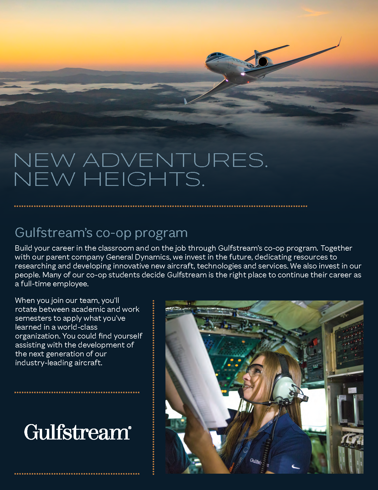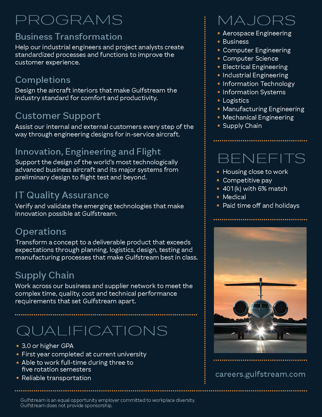 Click here for a video that provides information about the different positions that are available. Gulfstream is currently looking for Innovation, Engineering & Flight co-ops and Operations Engineering co-ops for Fall of 2021. Those positions are explained in the video.