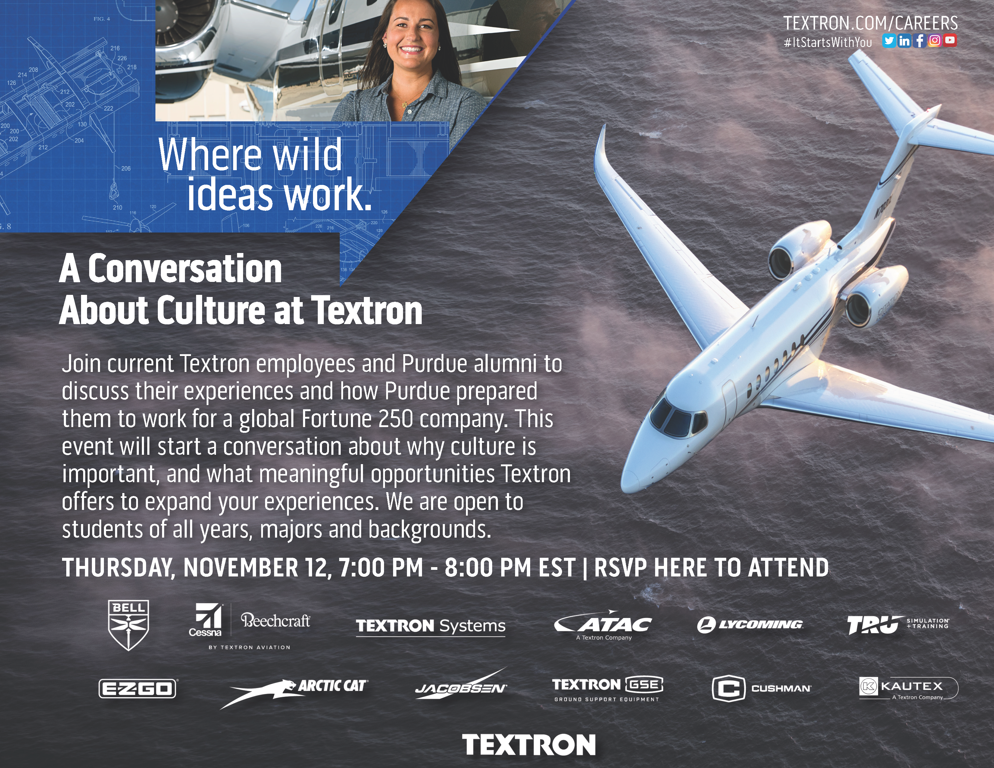 We would like to emphasize to students that Textron has a program where student ambassadors are able to refer individuals who have applied for positions and help make their applications stand out. It is our hope to help as many students out with this referral program as possible, as I know finding a job during these times can be a struggle. If you are interested in being referred, please contact bretzm@purdue.edu