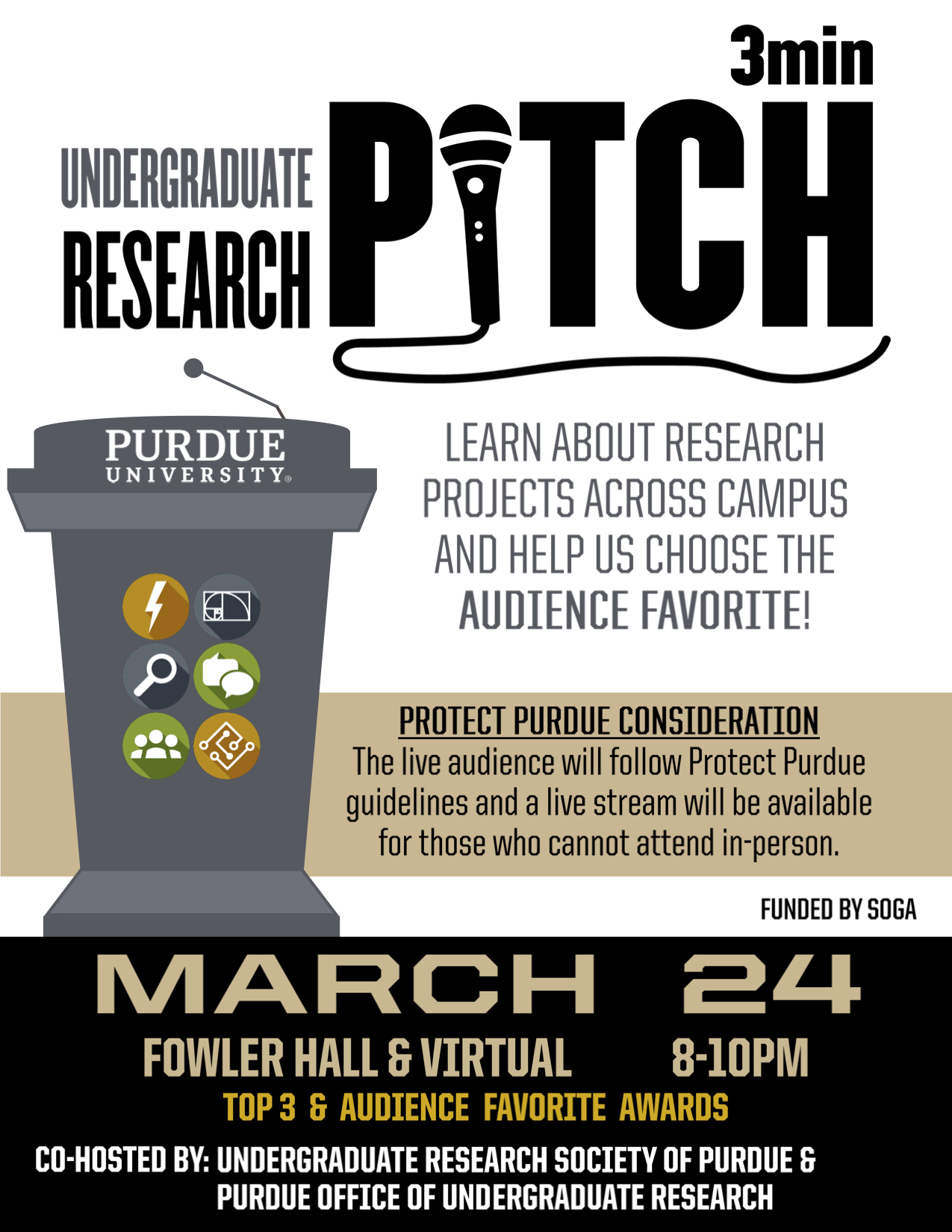 The 2021 Undergraduate Research Pitch Competition will be Wednesday, March 24 from 8pm-10pm as a hybrid event. There will be available seating in Fowler Hall and a YouTube livestream. The Pitch Competition highlights students' research projects, while promoting concise and effective storytelling during this judged event. RSVP here to receive updates and a reminder of the Pitch Competition. An audience choice award will be given to the presenter who receives the most votes following all of the presentations - this is where YOU can be part of the fun to decide who receives the $100 award. If you have any questions, please email ugrsp@purdue.edu.