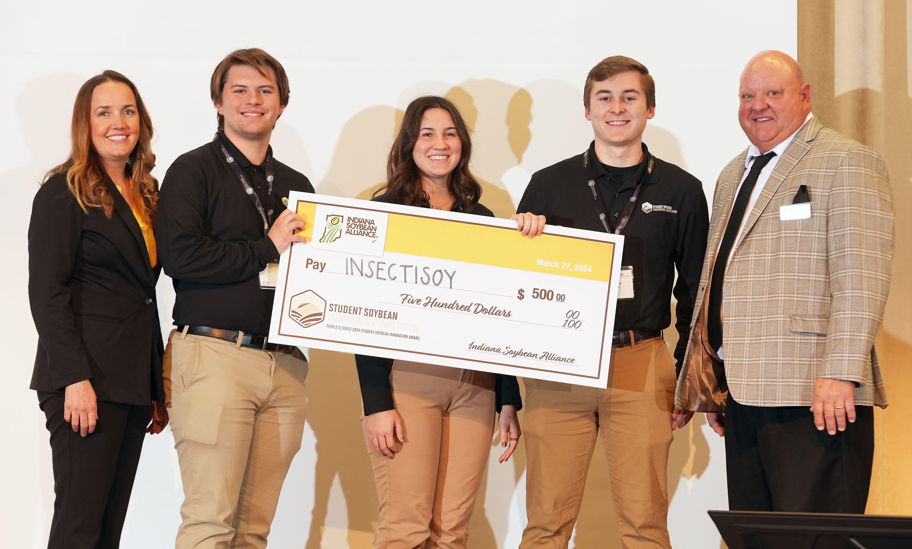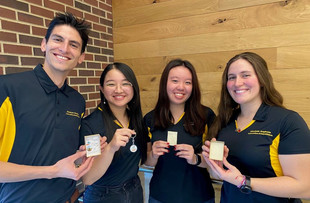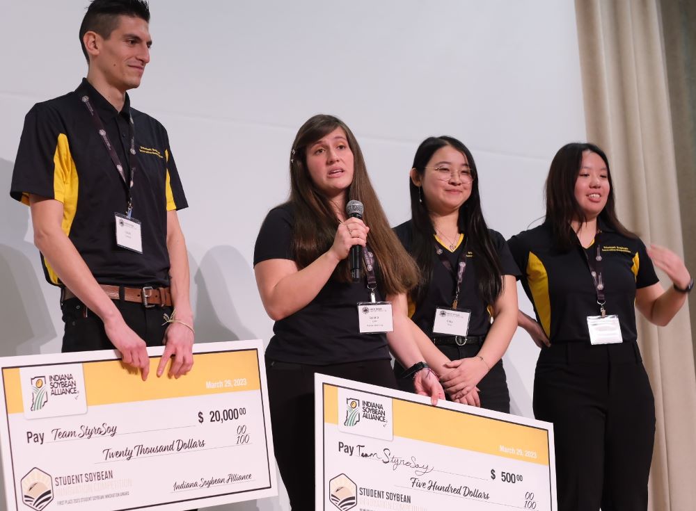 The group of four students will share a $20,000 prize for their winning entry, SoyFoliate, in the annual contest sponsored by the Indiana Soybean Alliance. The award was presented Tuesday (March 22) during a reception at the Indianapolis Roof Ballroom.