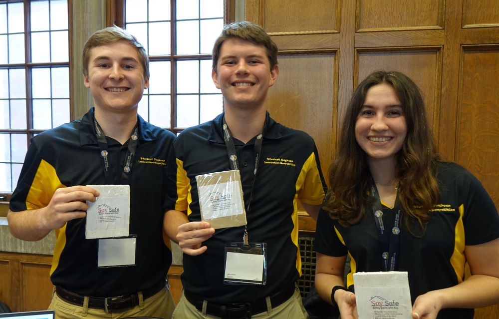This years winner is Sparked by Soy, a soy-based fire starter. Team members are; Evan Anderson a senior in Agricultural Engineering from Churubusco, Indiana, Dylan Lowden a senior in Environmental & Health Sciences from Fort Wayne, Indiana and Sara Richert a senior in Public Relations from Oak Park. Illinois.