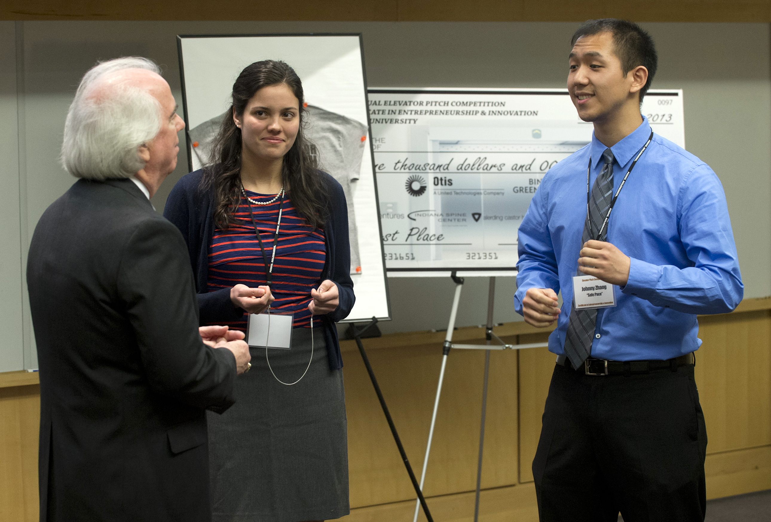 Mike Cassidy, far left, poses as an investor while biomedical engineering students Elizabeth Mercer and Johnny Zhang make a pitch on their device in the undergraduate division of the Purdue University Elevator Pitch Competition. Mercer, of Zionsville, Ind., and Zhang, of Mishawaka, Ind., lead the business concept called Safe Pace, which is developing an intra-surgical device designed to determine whether a pacemaker was implanted securely. (Purdue University photo/John Underwood)