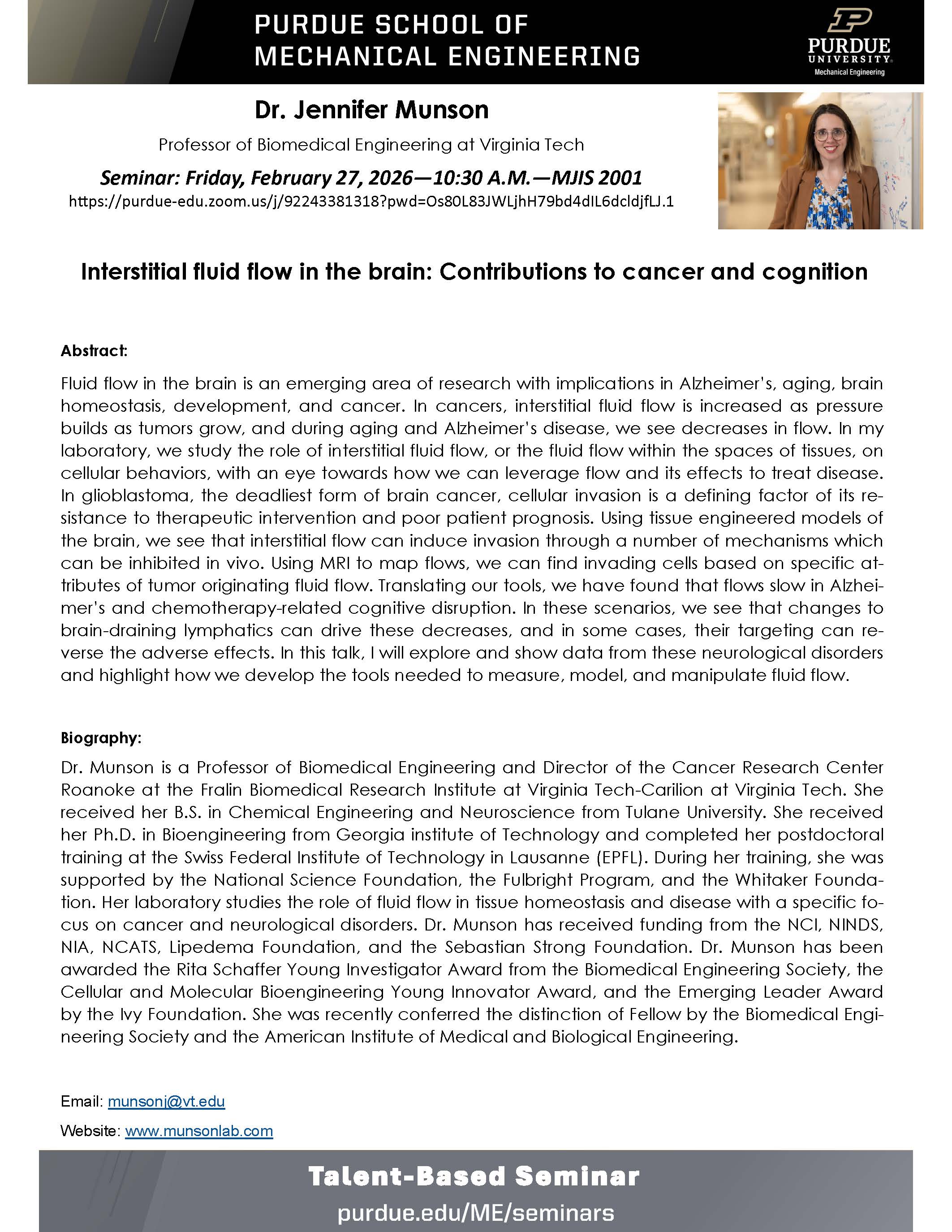 2026-02-27 10:30:00 2026-02-27 11:20:00 America/Indiana/Indianapolis Interstitial fluid flow in the brain: Contributions to cancer and cognition with Jennifer Munson, Professor of Biomedical Engineering at Virginia Tech MJIS 2001 or Zoom