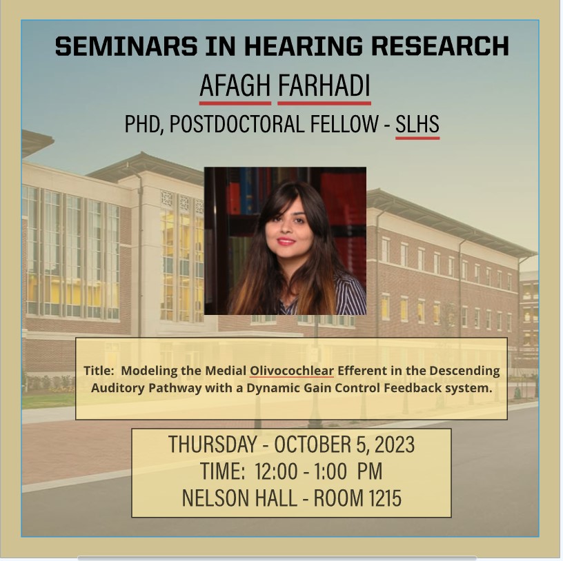 2023-10-05 12:00:00 2023-10-05 13:00:00 America/Indiana/Indianapolis Seminars in Hearing Research, October 5 Afagh Farhadi, Postdoctoral Fellow in SLHS will present "Modeling the Medial Olivocochlear Efferent in the Descending Auditory Pathway with a Dynamic Gain Control Feedback System" on Thursday, October 5, 12:00 noon in Nelson Hall, Room 115 as part of the Seminars in Hearing Research. Nelson Hall, Room 1215