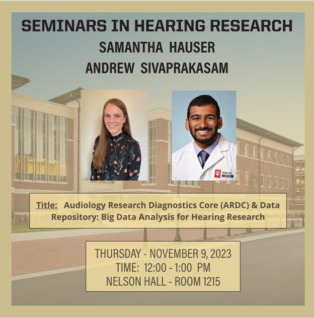 2023-11-09 12:00:00 2023-11-09 13:00:00 America/Indiana/Indianapolis Seminars in Hearing Research, Thursday, November 9 Samantha Hauser and Andrew Sivaprakasam will present "Audiology Research Diagnostics Core (ARDC) & Data Repository: Big Data Analysis for Hearing Research" on Thursday, November 9 at 12:00 noon in Nelson Hall, Room 1215 as part of the Seminars in Hearing Research. Nelson Hall, Room 1215