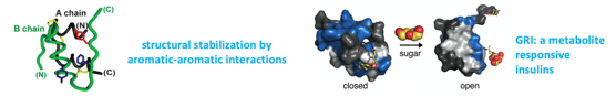 (a) Our laboratory at the IU School of Medicine (IUSM) has been involved in the structural optimization of insulin molecules by protein engineering. A key example is provided by stabilization via halogen-modified aromatic-aromotic interactions. Insulin's dimer assembly stabilizes the self-assembly and modification of the critical residues at this interface provide highly stable molecules for therapeutic applications. GRI's define a novel class of therapeutic analogs that are inactive at normal glucose levels, but become active at higher glucose levles as seen in patients with diabetes. Such a designis may be provided by chemical glucose sensor at one end of insulin molecule and diol molety on the other end.