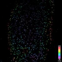 Caption: Nuclear pore complexes are massive protein assemblies embedded in the nuclear envelope that regulate the bidirectional transport of molecules between the nucleus and cytoplasm, playing a crucial role in cellular function and gene expression. Single-molecule localization microscopy (SMLM) surpasses the diffraction limit by precisely determining the positions of individual fluorophores, while 4Pi microscopy enhances achievable resolution through interferometric optical design. Together, 4Pi-SMLM facilitates 3D imaging of proteins with nanometer precision. The color code represents the depth (Z position) of the Nup96 proteins, as indicated by the color bar.
