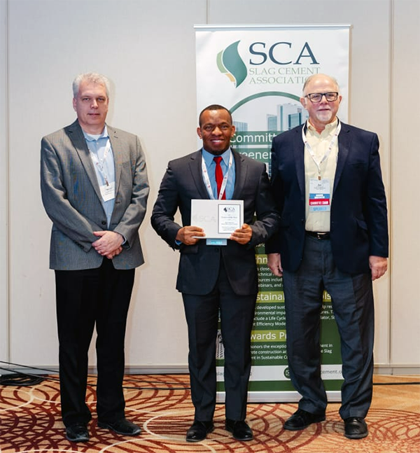 The Slag Cement Association (SCA) announced Chibueze Sylvester Ajuonuma and his research project, “Practical implementation of Internally Cured Slag Cement Concrete Using Superabsorbent Polymers,” as a winner of its 2024 Slag Cement in Sustainable Concrete Awards. The winning projects were unveiled and celebrated on April 2, 2025, during the spring ACI Concrete Convention in Toronto, Ontario, Canada.