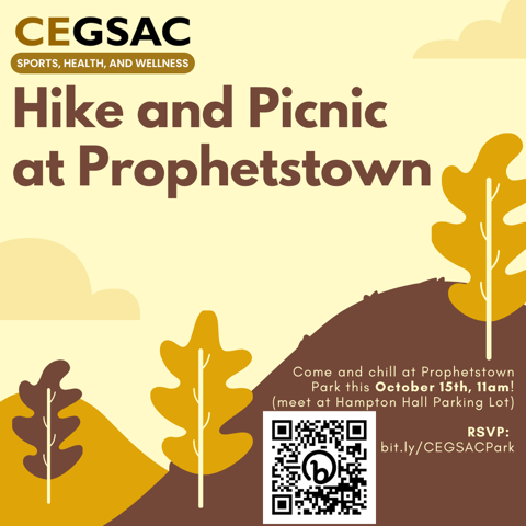 Come and chill at Prophetstown Park this October 15th, 11am! We will meet at Hampton Hall and carpool to the park. Please RSVP using bit.ly/CEGSACPark.