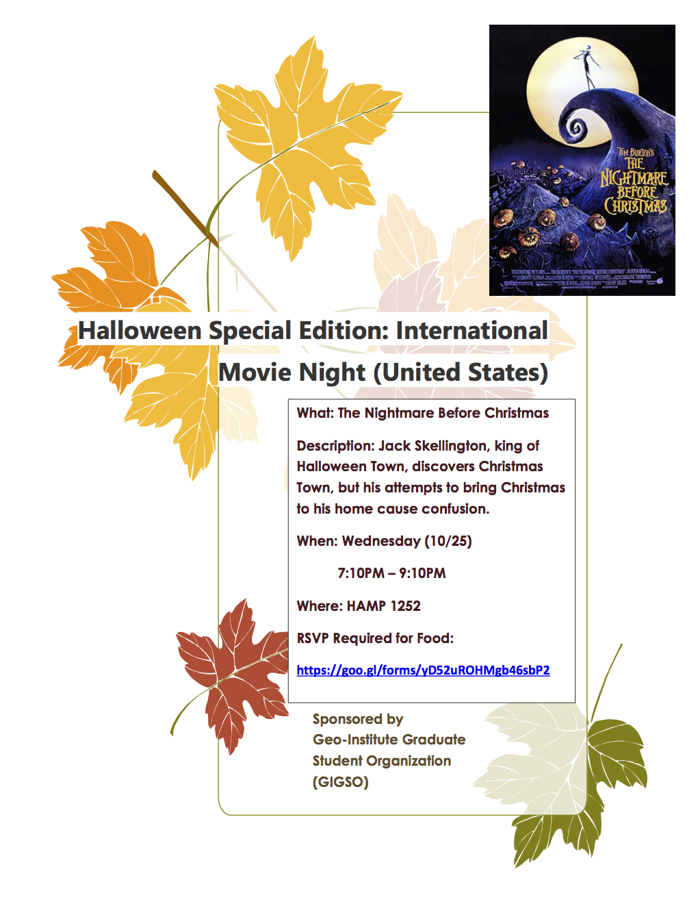 Our first movie night will be a classic, family friendly American movie celebrating Halloween called The Nightmare Before Christmas, on Wednesday (10/25) at 7:10PM in HAMP 1252.