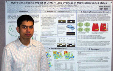 Sanjiv Kumar, a PhD Student working with Professor Venkatesh Merwade in the Hydraulics and Hydrology area of the School of Civil Engineering recently won the Outstanding Student Paper Award in the Hydrology Section at the 2008 fall meeting of the American Geophysical Union, held in San Francisco, CA. Sanjiv Kumar’s research paper “Hydro-climatological impact of century long drainage in Midwestern United States” presents a modeling framework to investigate the effect of artificial drainage on the climate and hydrology of the Midwest region. This study includes geospatial characterization of wetland drainage in the Midwest from 1860 to present, and climate modeling using Community Climate System Model. Sanjiv Kumar’s research is expected to shed light on the interaction between wetland drainage and the atmosphere, and how this interaction has affected the hydro-climatology of the Midwest. Dr. Dan Bain from University of Pittsburg is the third co-author on this paper.