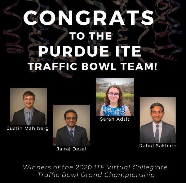 Congratulations to the Purdue Institute of Transportation Engineers (ITE) Traffic Bowl Team on winning the 2020 ITE Virtual Collegiate Traffic Bowl Grand Championship! The traffic bowl is an annual competition among ITE student chapter teams, and uses transportation planning and engineering topics for the clues, questions and answers.