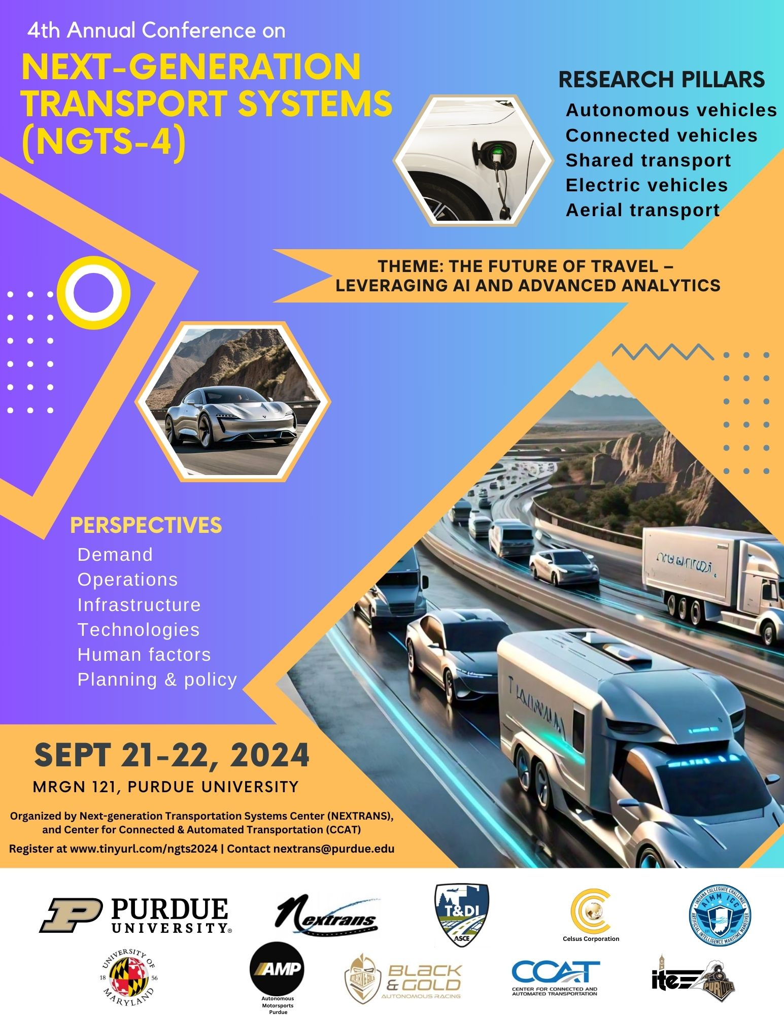 We are writing to invite you to participate and present your research at the upcoming 4th Annual Conference on Next Generation Transportation Systems (NGTS-4). The event will take place on Sept 21st and 22nd at Purdue University, in a hybrid format (both in-person and virtually).