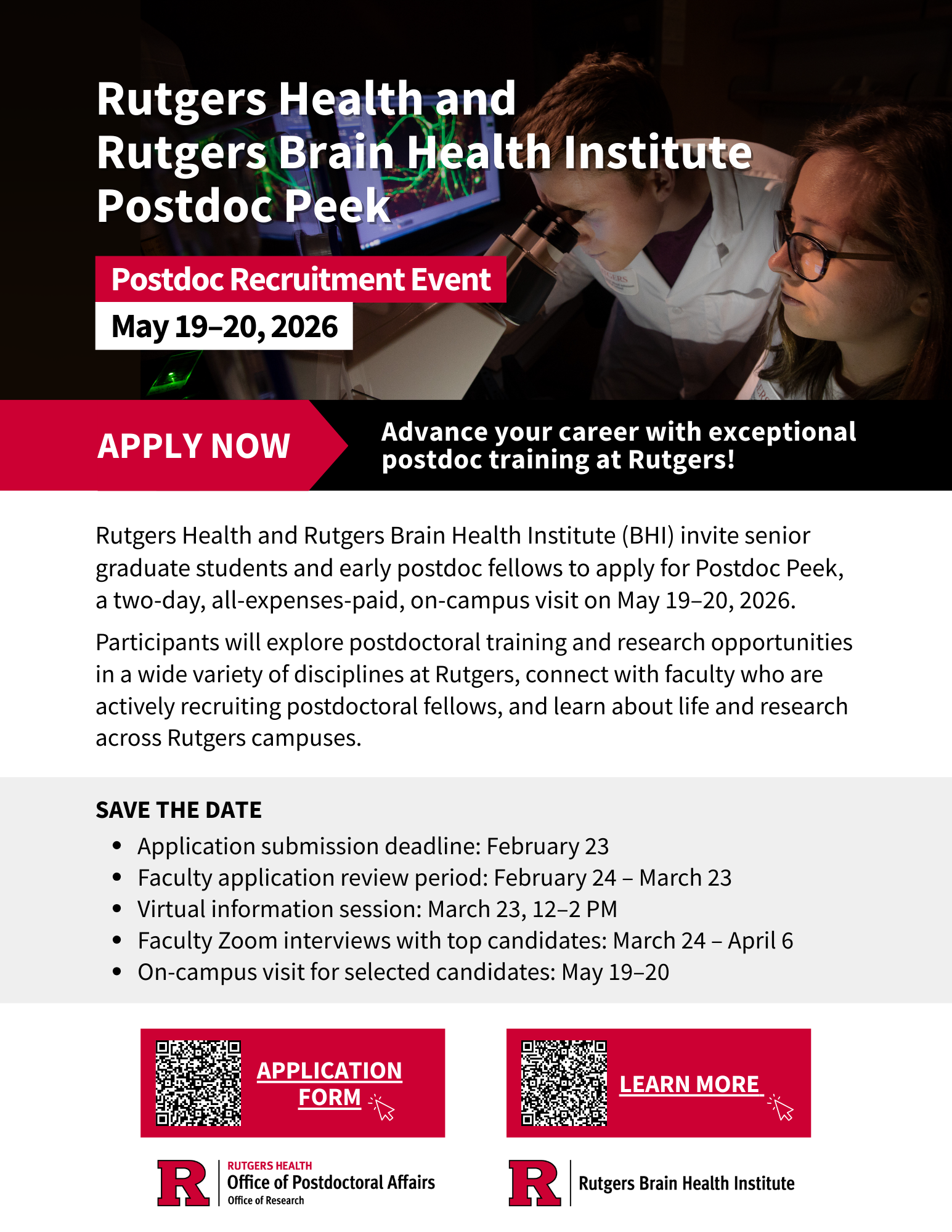 Rutgers Health and Rutgers Brain Health Institute (BHI) invite senior graduate students and early postdoc fellows to apply for Postdoc Peek, a two-day, all-expenses-paid, on-campus visit on May 19–20, 2026. Participants will explore postdoctoral training and research opportunities in a wide variety of disciplines at Rutgers, connect with faculty, and learn about life and research across Rutgers campuses. Learn more