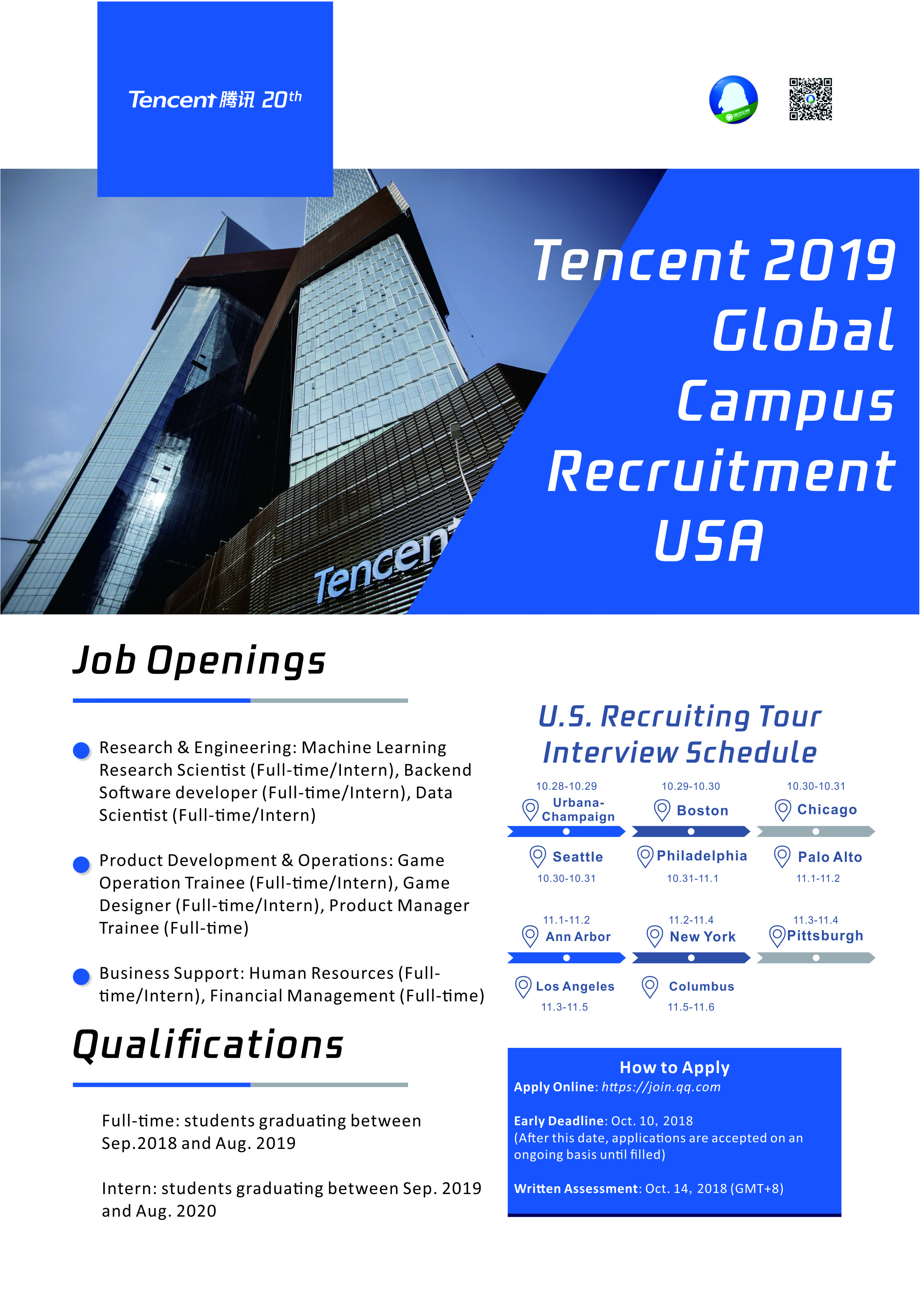 We will be touring the U.S. at the end of October / early November to interview students, interviewing in Chicago on Oct 30 to 31. We want to reach out to advertise our full-time (permanent) and intern positions for students graduating in 2019 and 2020, respectively, spanning a wide range of job families including AI research & engineer, game and product development, financial management and human resources, all based in China. That said, we are primarily targeting the engineering school, data science majors, and business school. For the game and product development jobs, students of all academic disciplines are welcome to apply. However, unfortunately due to visa restrictions and work authorization policies, we are primarily targeting Chinese students.