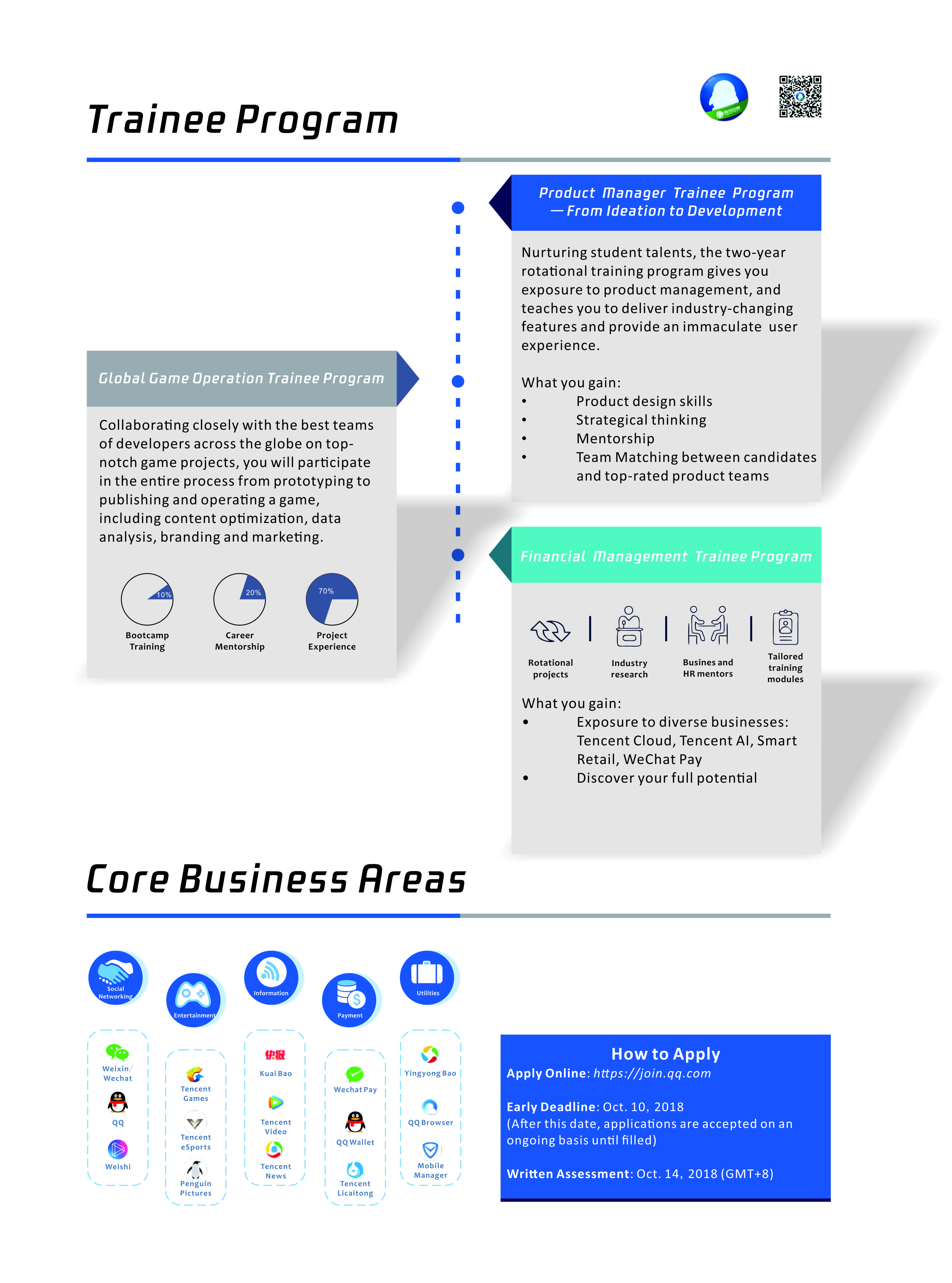 Tencent is one of the largest companies in China and hit a market cap of over $500 billion in 2017, ranked among the world’s top 10 most valuable IT companies. Our business specializes in a multitude of internet services including social network, gaming, entertainment, e-payment and AI research. We are now actively expanding our recruitment efforts outside of China and are keen to connect with schools and student talents.