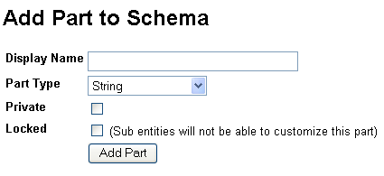 Below the resource schema table is the "Add Part to Schema" form. Here you can add additional parts the schema for a resource type.