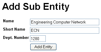 After supplying a Name and Short Name click the "Add Entity" button. This returns you to the Entity Overview Screen. Notice that the new entity is listed in the Sub Entities box on the right half of the screen.
