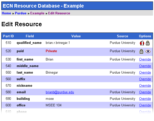 At each entity the information for a resource can be customized. For example within "The Engineering Computer Network" a person may have a different title than they do at Purdue University. Within "The Engineering Computer Network" people may also have a current project associated with them that does not apply to "The Schools of Engineering".