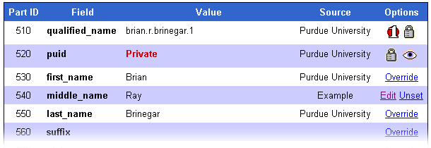Information about people within the "Purdue University" entity comes from the Purdue Electronic Directory and I2A2. This means you can add a Purdue Person to your entity and have information about that person available without doing any data entry. The information automatically available includes: