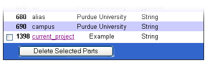Once a part is added it can be removed by selecting the checkbox next to its name and clicking the "Delete Selected Parts" button. A part can only be deleted by the entity that created it.