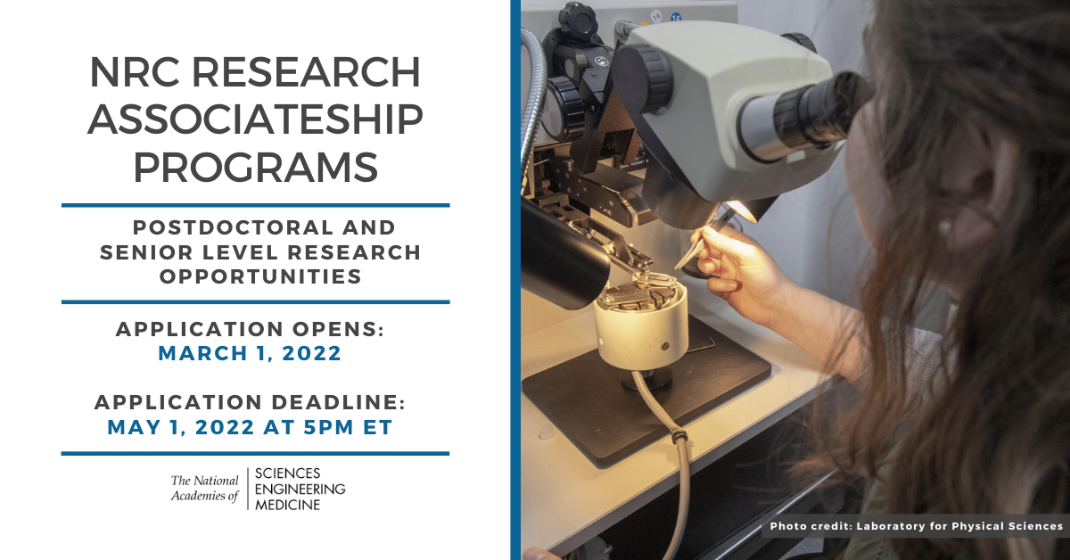 The National Academies of Sciences, Engineering, and Medicine administers postdoctoral and senior research awards at participating federal laboratories and affiliated institutions<http://pull.xmr3.com/p/2198-53CD/508588346/af471e4b-1527-4317-892b-57ad478a621c.html> at locations throughout the U.S and abroad.