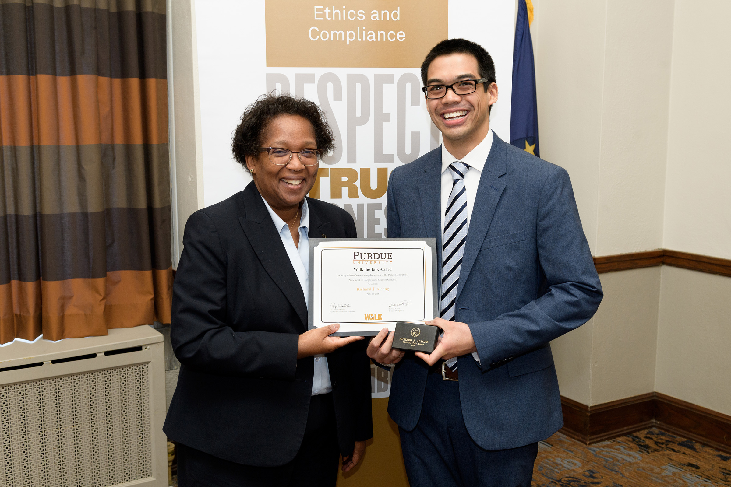 The Purdue community is encouraged to nominate a member of the Purdue faculty, staff or student body who demonstrates a commitment to ethics, integrity and compliance for the Walk the Talk Award. Nominations are accepted year-round and may be submitted by completing the nomination form on the webpage of the Office of the Vice President for Ethics and Compliance.