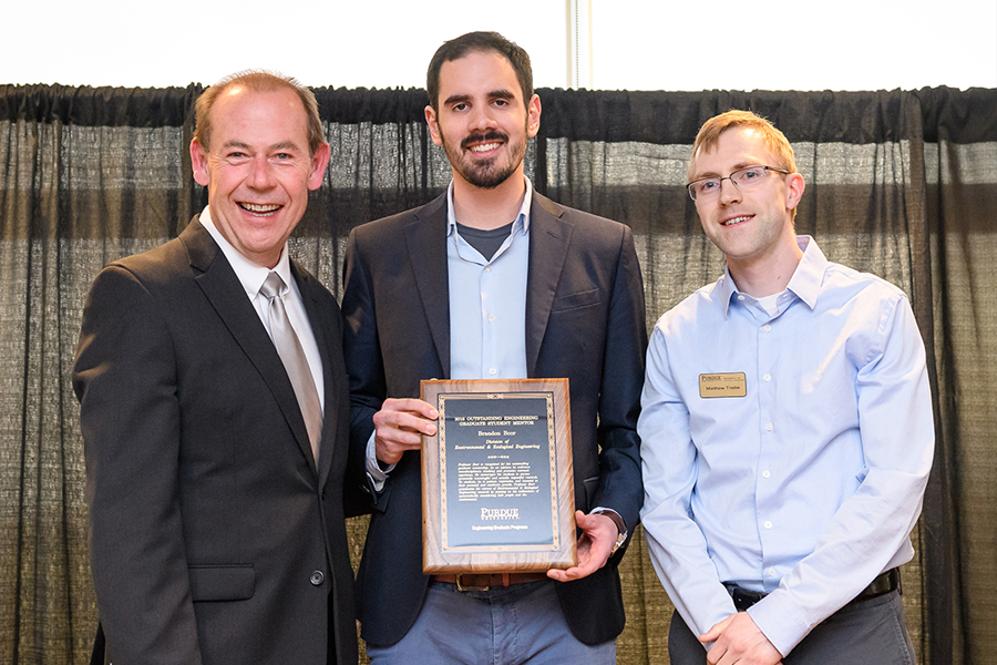 Matt Triebe (President, EEE Graduate Student Organization) (right) and John W. Sutherland (Professor and Fehsenfeld Family Head, Environmental and Ecological Engineering) (left), present CE Assistant Professor, Brandon Boor, who has a courtesy appointment in EEE, with the 2018 Outstanding Engineering Graduate Student Mentor Award at the 2018 EEE Recognition Night.