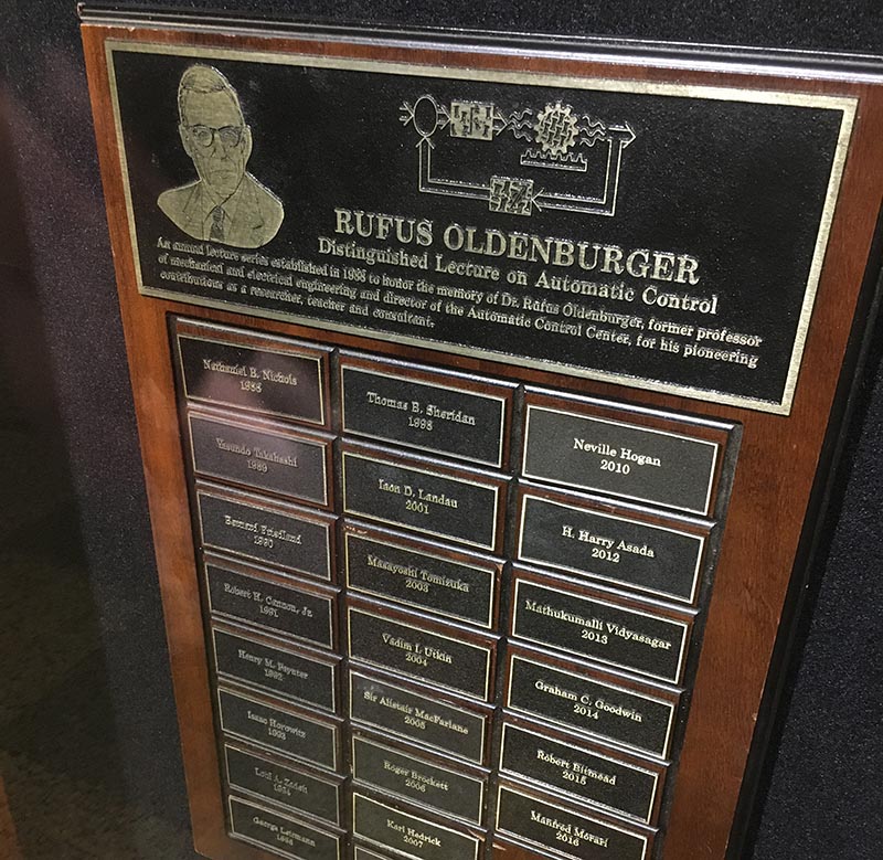 The plaque on the wall says, "Rufus Oldenburger Distinguished Lecture on Automatic Control." Students pass by it every day, in the hallway of the Mechanical Engineering building at Purdue University. It lists a who's who of distinguished faculty, academic researchers, and industry practitioners -- all of whom have personally visited Purdue to lecture in the field of automatic control. While students may be curious about the names, it's the one at the top that is most notable: Oldenburger.