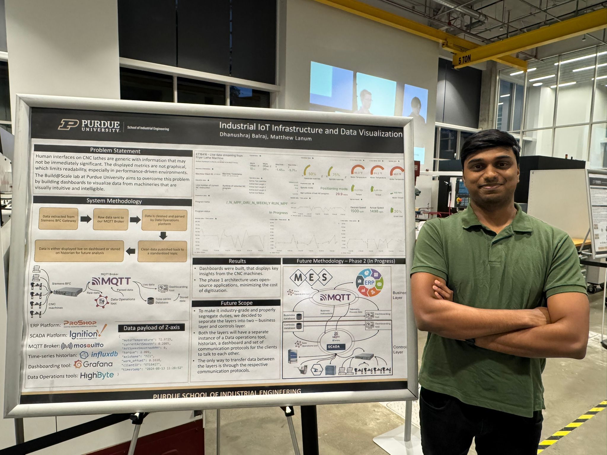 As part of the tour of the Gateway facility, guests were given a look at the latest updates within the Build @ Scale Lab in Lambertus Hall. During the tour students like MS student Dhanushraj "Dhanush" Balraj presented their research and efforts into developing a fully automated "lights out manufacturing" facility. "I got the opportunity to showcase the enhanced version of the Purdue Model I developed, and how separating the Business and Controls layer could improve segregation of duties and efficient data transfers for M2M communications."