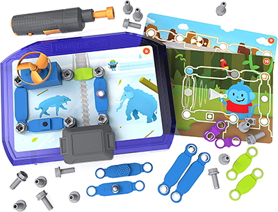 The toy comes with a board, a toy power drill, bolts, circuit connectors, a battery pack, a Mission Manual, and 10 double-sided activity cards. The power drill requires 3 AA batteries, which are not included. Children follow the Mission Manual and activity cards to create 20 different circuit layouts. The circuits include fun elements such as lights, a speaker and a fan. The Mission Manual provides children with a story to go along with the circuit they are constructing to make the toy engaging and fun. The activity card can be laid over the board to show where each component of the circuit needs to be placed on the board and the order the pieces should be placed in. Children use the included toy power drill and bolts to secure each element of the circuit to the board. The activities become progressively more challenging as children progress through the toy by showing less information on the cards and requiring the use of more circuitry elements. Younger children may need adult assistance while playing with this, as some reading is required and there are moving components and projectiles.