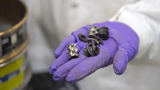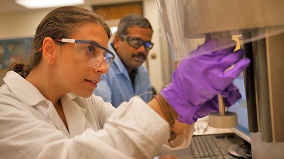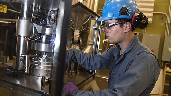 Ph.D. student Shrikant Swaminathan inserts a punch for producing a rectangular powder compact for measuring pharmaceutical powder properties.