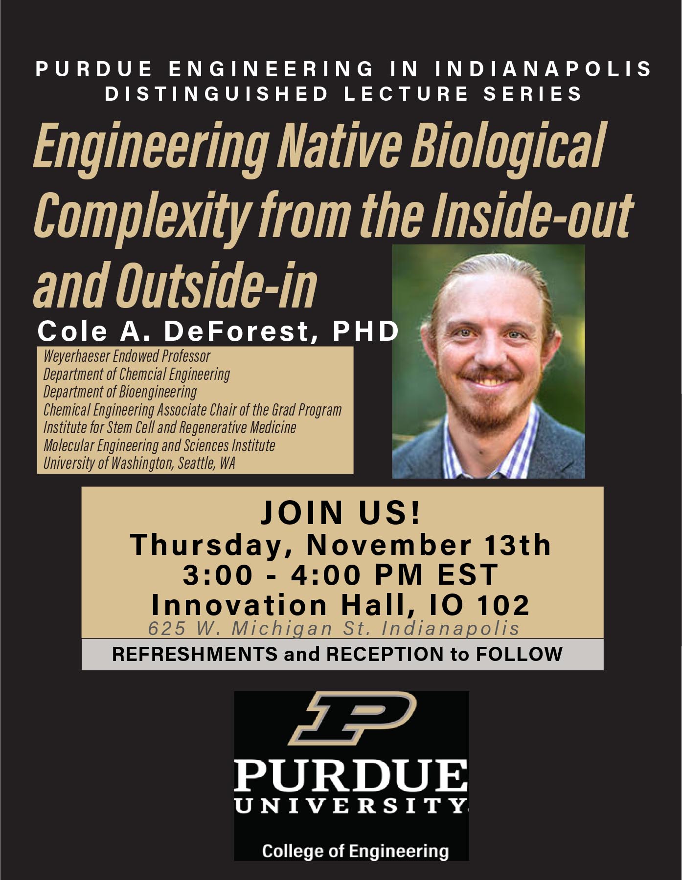 BIO: Dr. Cole A. DeForest is the Weyerhaeuser Endowed Professor in the Departments of Chemical Engineering and Bioengineering, the Associate Chair and Graduate Program Director of Chemical Engineering, the Director of Education of the Molecular Engineering & Sciences Institute, as well as a core faculty member of the Institute for Stem Cell & Regenerative Medicine at the University of Washington (UW) where he began in 2014. He received his B.S.E. degree from Princeton University in 2006, majoring in Chemical Engineering and minoring in Material Science Engineering and Bioengineering. He earned his Ph.D. degree under the guidance of Dr. Kristi Anseth from the University of Colorado in Chemical and Biological Engineering with an additional certificate in Molecular Biophysics. His postdoctoral research was performed with Dr. David Tirrell in the Divisions of Chemistry and Chemical Engineering at the California Institute of Technology (Caltech). He has published ~90 peer-reviewed articles, including as the corresponding author for those appearing in Nature Materials, Nature Chemistry, Nature Chemical Engineering, Nature Chemical Biology, Advanced Materials, JACS, PNAS, Science Advances, Nature Reviews Materials, and Nature Reviews Bioengineering. Dr. DeForest has received numerous research awards and honors including the Society for Biomaterials’ Mid-Career Award (2025) and Young Investigator Award (2020), NIH Maximizing Investigators’ Research Award (MIRA R35, 2020), NSF CAREER Award (2017), and many others. Notably, he has also been recognized for excellence in teaching and was awarded the UW Presidential Distinguished Teaching Award (2016), given annually to a single Assistant Professor across all of the UW, as well as the UW Outstanding Undergraduate Research Mentor Award (2025), given annually to a single engineering professor at UW. His research has been supported through fellowships and grants from the National Science Foundation, the National Institutes of Health, the Defense Advanced Research Projects Agency, and the US Department of Education.