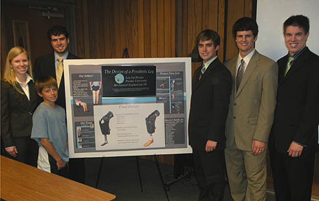 First place in the 2009 Thomas J. and Sandra H. Malott Innovation Award in Mechanical Engineering has been awarded to the "Leg Up Design" team for their development of a custom prosthetic leg for a 12-year-old boy from Martinsville, Indiana. It was one of 25 team-based projects showcasing a semester's work of creativity, design, prototyping and testing in the ME463 senior design class. Team members David Armbrust, Christine DeWert, Dan Gorsky, Brian Schoolcraft, and Tommy Thigpen received a joint cash prize of $1500, which they donated to the boy and his family to support improvements to the prosthesis over the next two years.