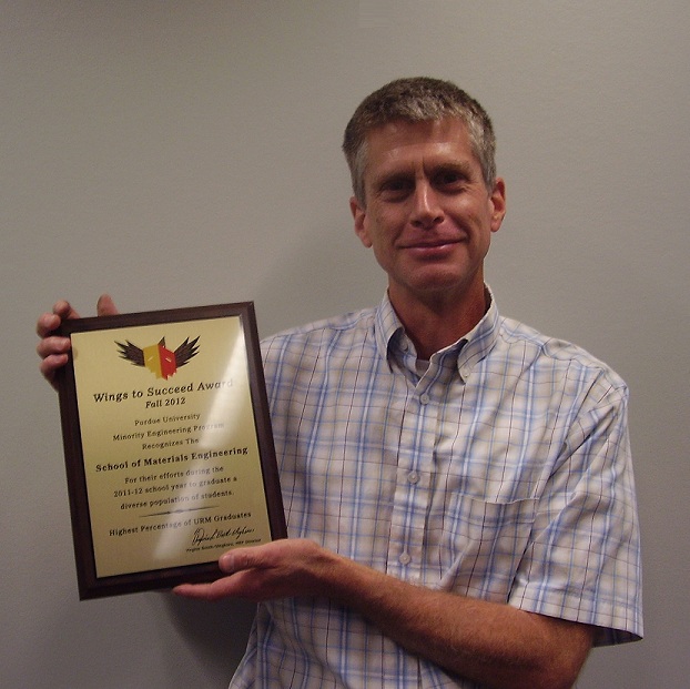 On September 10, 2012, MSE Professor and Undergraduate Chair, David Johnson, proudly accepted the Purdue Minority Engineering Program & "Wings to Succeed" award. This award, which was based on graduation statistics from Fall 2011 through Summer 2012, was presented to Materials Engineering for the highest percent of under-represented minorities (15%), more than double any of Purdue's other engineering schools.