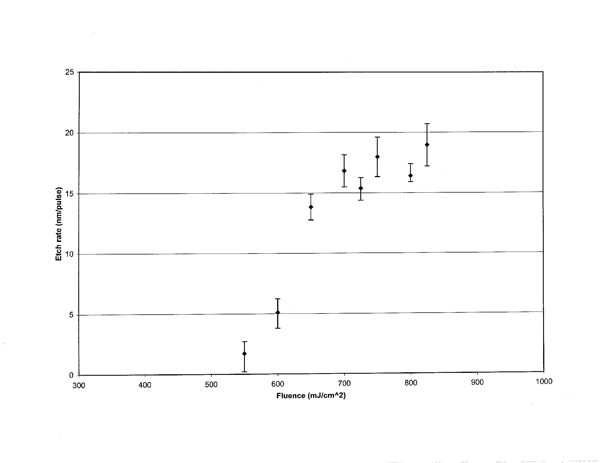 - The data comparing fluence and etch rate suggest a threshold fluence in the range of 500-550 mJ/cm.2 A sharp increase in etch rate was observed as the fluence was increased from 600-750 mJ/cm.2 Following the sharp increase, a saturation point appeared as seen in figure 2 below.