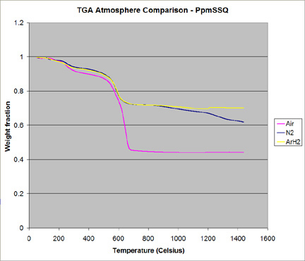 ![]() Thermogravimetric behavior of poly(phenyl-methyl-silsesquioxane) in different atmospheres. |