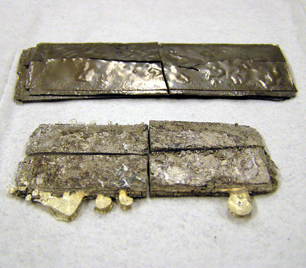 ![]() Aluminum/poly(phenyl-methyl-silsesquioxane) laminate (front) and titanium/poly(phenyl-methyl-silsesquioxane) laminate (back), both heated to 700oC in air for 3 hours. |