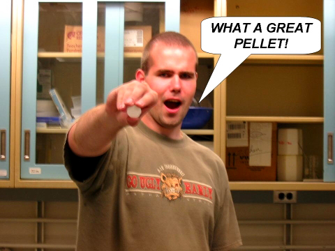 Flaws on pellet surfaces were examined using an optical microscope. Quantitative surface roughness data was gathered using a profilometer, a device that operates by running a stylus across the pellet surface. The device output is used to determine the average roughness. Nine scans were taken on each side of a pellet, thereby providing a good statistics regarding pellet roughness.