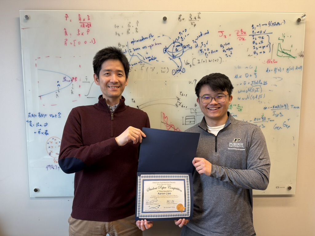 Graduate student Aaron Liao won the first place in the student paper competition at 2026 AAS GNC conference held in Breckenridge, CO. He received the award for his paper entitled "A Higher-Order Autonomous Navigation Filter for Nonlinear Dynamics and Non-Gaussian Distributions".